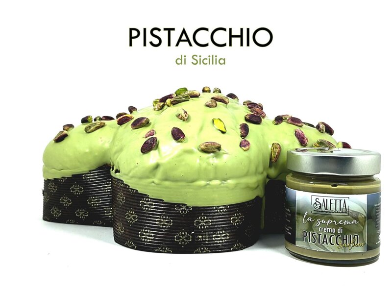 Colomba artigianale con glassa al gusto di pistacchio e pistacchi interi siciliani tostati, accompagnata dal vasetto di crema dolce da spalmare "la suprema" con il 40% di pistacchi siciliani coltivati nella zona agrigentina principalmente nella città di Raffadali (AG).