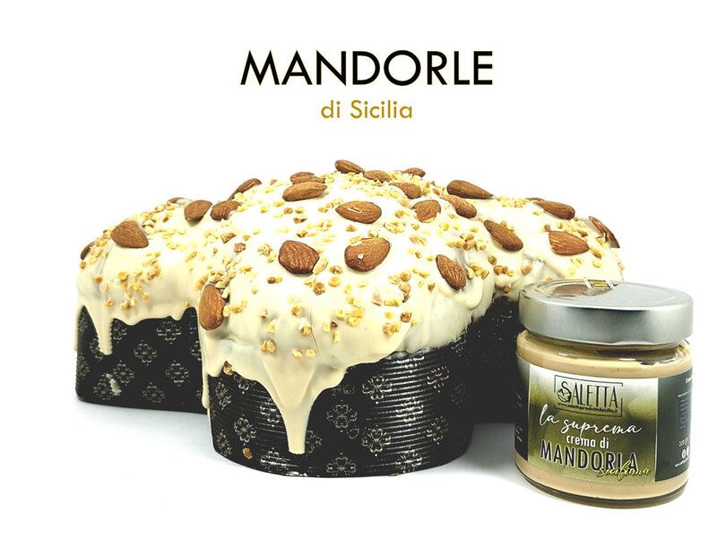 Colomba artigianale con glassa al gusto di mandorla accompagnata dal vasetto di crema dolce da spalmare "la suprema" con il 40% di mandorle siciliane coltivate principalmente nella Valle del Torto tra le città di Caccamo - Roccapalumba - Montemaggiore Belsito (PA).