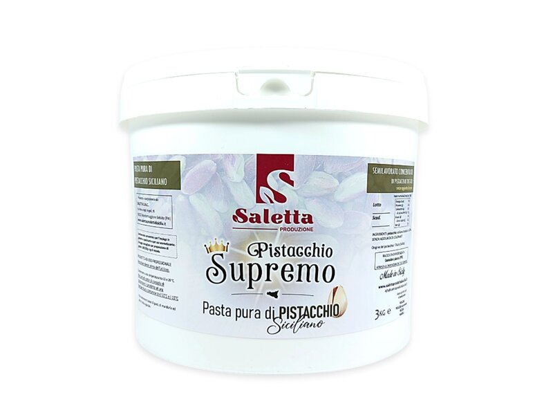 Pistacchio Supremo. Finissima Pasta pura di PISTACCHIO al 100%, realizzata con pistacchi siciliani provenienti dalle coltivazione in provincia di Agrigento. Semilavorato concentrato di pistacchio tostato per l'impiego in gelateria e pasticceria nella realizzazione di Gelato artigianale.